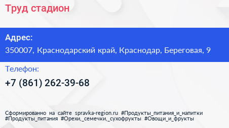 Труд, стадион по адресу 350007, Краснодарский край, Краснодар, Береговая, 9 в дальнейшем Организация, размещена в следующих категориях: