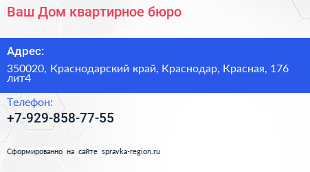 Ваш Дом, квартирное бюро по адресу 350020, Краснодарский край, Краснодар, Красная, 176 лит4 в дальнейшем Организация, размещена в следующих категориях: