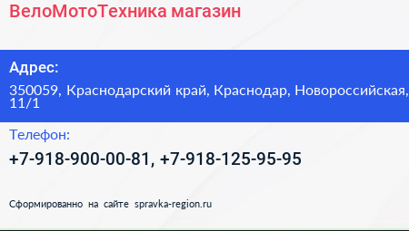 ВелоМотоТехника, магазин по адресу 350059, Краснодарский край, Краснодар, Новороссийская, 11/1 в дальнейшем Организация, размещена в следующих категориях: