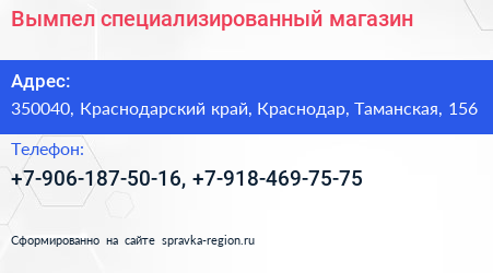 Вымпел, специализированный магазин по адресу 350040, Краснодарский край, Краснодар, Таманская, 156 в дальнейшем Организация, размещена в следующих категориях: