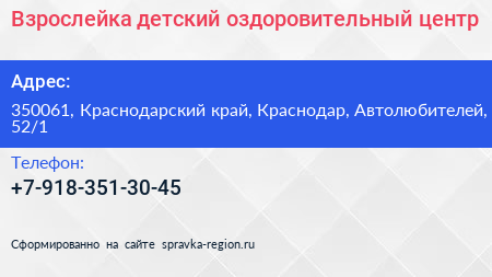 Взрослейка, детский оздоровительный центр по адресу 350061, Краснодарский край, Краснодар, Автолюбителей, 52/1 в дальнейшем Организация, размещена в следующих категориях: