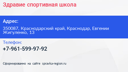 Здравие, спортивная школа по адресу 350087, Краснодарский край, Краснодар, Евгении Жигуленко, 13 в дальнейшем Организация, размещена в следующих категориях:
