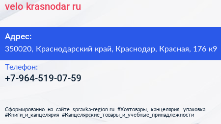 velo-krasnodar.ru по адресу 350020, Краснодарский край, Краснодар, Красная, 176 к9 в дальнейшем Организация, размещена в следующих категориях: