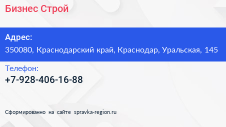 Бизнес-Строй по адресу 350080, Краснодарский край, Краснодар, Уральская, 145 в дальнейшем Организация, размещена в следующих категориях: