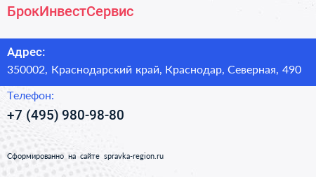 БрокИнвестСервис по адресу 350002, Краснодарский край, Краснодар, Северная, 490 в дальнейшем Организация, размещена в следующих категориях: