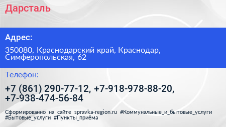 Дарсталь по адресу 350080, Краснодарский край, Краснодар, Симферопольская, 62 в дальнейшем Организация, размещена в следующих категориях: