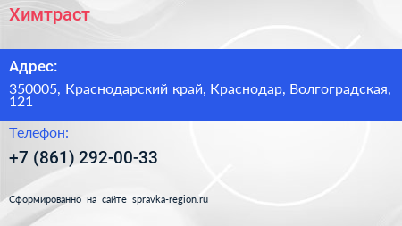 Химтраст по адресу 350005, Краснодарский край, Краснодар, Волгоградская, 121 в дальнейшем Организация, размещена в следующих категориях: