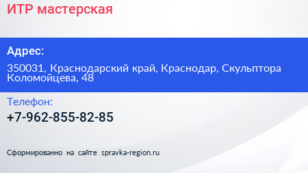 ИТР, мастерская по адресу 350031, Краснодарский край, Краснодар, Скульптора Коломойцева, 48 в дальнейшем Организация, размещена в следующих категориях: