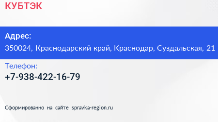 КУБТЭК по адресу 350024, Краснодарский край, Краснодар, Суздальская, 21 в дальнейшем Организация, размещена в следующих категориях: