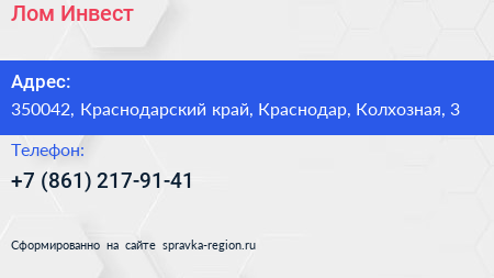 Лом Инвест по адресу 350042, Краснодарский край, Краснодар, Колхозная, 3 в дальнейшем Организация, размещена в следующих категориях: