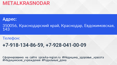 METALKRASNODAR по адресу 350056, Краснодарский край, Краснодар, Евдокимовская, 143 в дальнейшем Организация, размещена в следующих категориях: