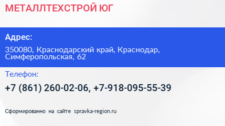 МЕТАЛЛТЕХСТРОЙ-ЮГ по адресу 350080, Краснодарский край, Краснодар, Симферопольская, 62 в дальнейшем Организация, размещена в следующих категориях: