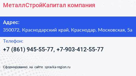 МеталлСтройКапитал, компания по адресу 350072, Краснодарский край, Краснодар, Московская, 5а в дальнейшем Организация, размещена в следующих категориях: