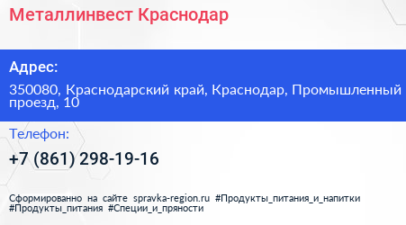 Металлинвест-Краснодар по адресу 350080, Краснодарский край, Краснодар, Промышленный проезд, 10 в дальнейшем Организация, размещена в следующих категориях: