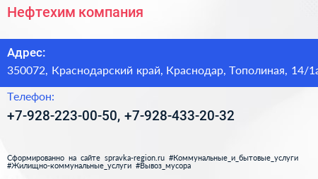 Нефтехим, компания по адресу 350072, Краснодарский край, Краснодар, Тополиная, 14/1а в дальнейшем Организация, размещена в следующих категориях: