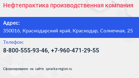 Нефтепрактика, производственная компания по адресу 350016, Краснодарский край, Краснодар, Солнечная, 25 в дальнейшем Организация, размещена в следующих категориях: