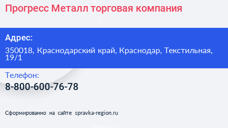 Прогресс Металл, торговая компания по адресу 350018, Краснодарский край, Краснодар, Текстильная, 19/1 в дальнейшем Организация, размещена в следующих категориях: