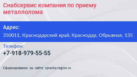 Снабсервис, компания по приему металлолома по адресу 350011, Краснодарский край, Краснодар, Обрывная, 135 в дальнейшем Организация, размещена в следующих категориях: