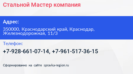 Стальной Мастер, компания по адресу 350000, Краснодарский край, Краснодар, Железнодорожная, 11/3 в дальнейшем Организация, размещена в следующих категориях:
