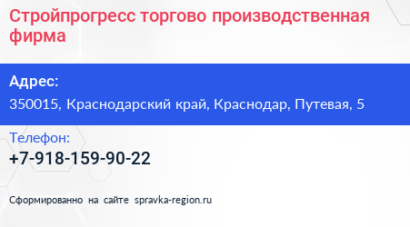 Стройпрогресс, торгово-производственная фирма по адресу 350015, Краснодарский край, Краснодар, Путевая, 5 в дальнейшем Организация, размещена в следующих категориях: