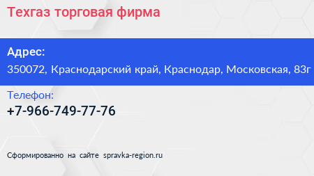 Техгаз, торговая фирма по адресу 350072, Краснодарский край, Краснодар, Московская, 83г в дальнейшем Организация, размещена в следующих категориях: