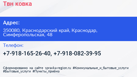 Твн-ковка по адресу 350080, Краснодарский край, Краснодар, Симферопольская, 48 в дальнейшем Организация, размещена в следующих категориях: