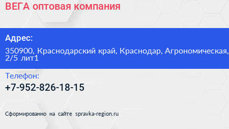 ВЕГА, оптовая компания по адресу 350900, Краснодарский край, Краснодар, Агрономическая, 2/5 лит1 в дальнейшем Организация, размещена в следующих категориях: