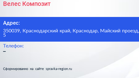 Велес Композит по адресу 350039, Краснодарский край, Краснодар, Майский проезд, 5 в дальнейшем Организация, размещена в следующих категориях: