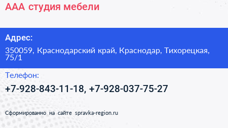 ААА, студия мебели по адресу 350059, Краснодарский край, Краснодар, Тихорецкая, 75/1 в дальнейшем Организация, размещена в следующих категориях: