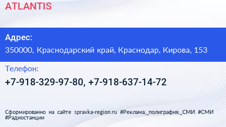 ATLANTIS по адресу 350000, Краснодарский край, Краснодар, Кирова, 153 в дальнейшем Организация, размещена в следующих категориях: