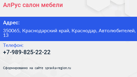 АлРус, салон мебели по адресу 350065, Краснодарский край, Краснодар, Автолюбителей, 13 в дальнейшем Организация, размещена в следующих категориях: