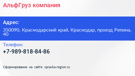 АльфГруз, компания по адресу 350090, Краснодарский край, Краснодар, проезд Репина, 40 в дальнейшем Организация, размещена в следующих категориях:
