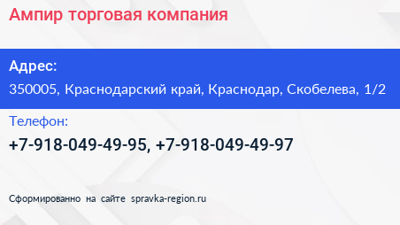 Ампир, торговая компания по адресу 350005, Краснодарский край, Краснодар, Скобелева, 1/2 в дальнейшем Организация, размещена в следующих категориях: