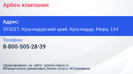 Арбен, компания по адресу 353217, Краснодарский край, Краснодар, Мира, 114 в дальнейшем Организация, размещена в следующих категориях: