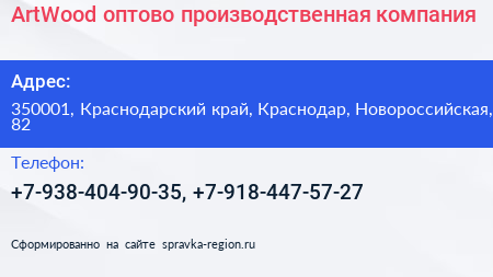 ArtWood, оптово-производственная компания по адресу 350001, Краснодарский край, Краснодар, Новороссийская, 82 в дальнейшем Организация, размещена в следующих категориях: