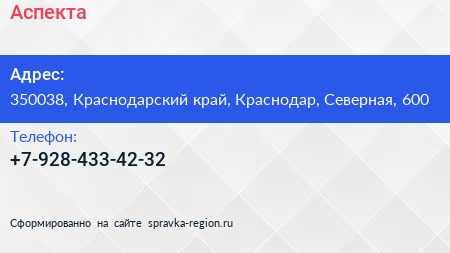 Аспекта по адресу 350038, Краснодарский край, Краснодар, Северная, 600 в дальнейшем Организация, размещена в следующих категориях: