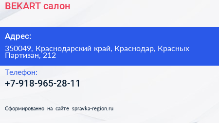 BEKART, салон по адресу 350049, Краснодарский край, Краснодар, Красных Партизан, 212 в дальнейшем Организация, размещена в следующих категориях: