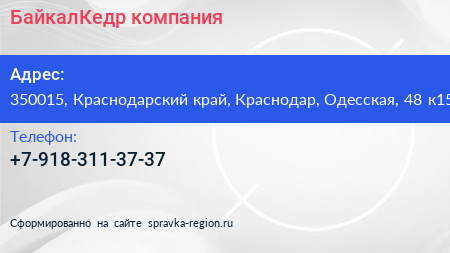 БайкалКедр, компания по адресу 350015, Краснодарский край, Краснодар, Одесская, 48 к15 в дальнейшем Организация, размещена в следующих категориях: