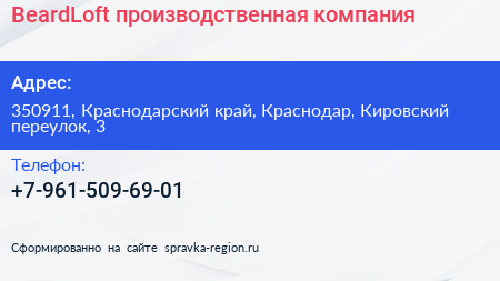 BeardLoft, производственная компания по адресу 350911, Краснодарский край, Краснодар, Кировский переулок, 3 в дальнейшем Организация, размещена в следующих категориях: