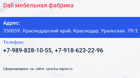 Dali, мебельная фабрика по адресу 350059, Краснодарский край, Краснодар, Уральская, 79/1 в дальнейшем Организация, размещена в следующих категориях: