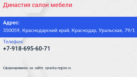 Династия, салон мебели по адресу 350059, Краснодарский край, Краснодар, Уральская, 79/1 в дальнейшем Организация, размещена в следующих категориях: