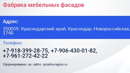 Фабрика мебельных фасадов по адресу 350059, Краснодарский край, Краснодар, Новороссийская, 174Б в дальнейшем Организация, размещена в следующих категориях:
