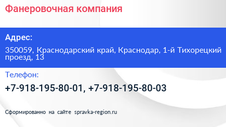 Фанеровочная компания по адресу 350059, Краснодарский край, Краснодар, 1-й Тихорецкий проезд, 13 в дальнейшем Организация, размещена в следующих категориях: