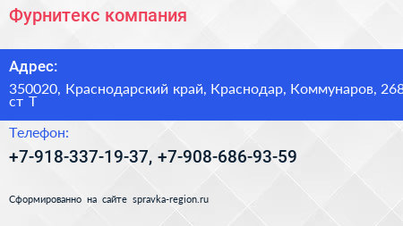 Фурнитекс, компания по адресу 350020, Краснодарский край, Краснодар, Коммунаров, 268 ст Т в дальнейшем Организация, размещена в следующих категориях:
