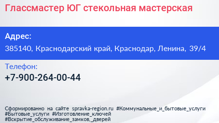 Глассмастер-ЮГ, стекольная мастерская по адресу 385140, Краснодарский край, Краснодар, Ленина, 39/4 в дальнейшем Организация, размещена в следующих категориях: