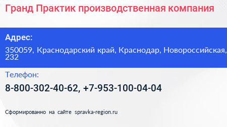 Гранд Практик, производственная компания по адресу 350059, Краснодарский край, Краснодар, Новороссийская, 232 в дальнейшем Организация, размещена в следующих категориях: