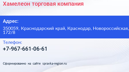 Хамелеон, торговая компания по адресу 350059, Краснодарский край, Краснодар, Новороссийская, 172/8 в дальнейшем Организация, размещена в следующих категориях: