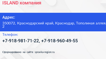 ISLAND, компания по адресу 350072, Краснодарский край, Краснодар, Тополиная аллея, 2 в дальнейшем Организация, размещена в следующих категориях: