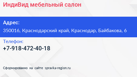 ИндиВид, мебельный салон по адресу 350016, Краснодарский край, Краснодар, Байбакова, 6 в дальнейшем Организация, размещена в следующих категориях: