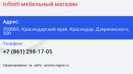 Infiniti, мебельный магазин по адресу 350005, Краснодарский край, Краснодар, Дзержинского, 100 в дальнейшем Организация, размещена в следующих категориях: